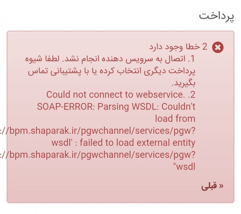 master_hesam ارسال شده در مرداد 18، 2018 گزارش Share ارسال شده در مرداد 18، 2018 سلام خسته نباشید ورژن فروشگاه من 1.6.18 ورژن php 5.6 ماژولو نصب کردم دیباگش هم روشن دیباگ چیزی نمیاره اما تراکشو بانک میگه موفق برمیگرده به سایت میزنه ناموفق 1-خطا وجود داره 1.Arrey با درگاه سامان هم که پرداخت میکنم بانک میزنه موفق میخواد برگرده به سایت و سفارشو ثبت کنه میزنه نا موفق این ارورو میده ExceedsWithdrawalAmountLimit خواهشا کمک کنید 1 خطا وجود دارد دیباگ را روشن کردن این خطا را میدهد 1 خطا وجود دارد Notice: Array to string conversion in /home2/zarkitir/public_html/cache/smarty/compile/3a/7f/42/3a7f42b3edad7db3372630163065f41b64fe0415.file.errors.tpl.php on line 43 Array لاین 43 این در فایل مذکور به این شکل است: <li><?php echo $_smarty_tpl->tpl_vars['error']->value;?> </li> <?php } ?> </ol> <?php if (isset($_SERVER['HTTP_REFERER'])&&!strstr($_smarty_tpl->tpl_vars['request_uri']->value,'authentication')&&preg_replace('#^https?://[^/]+/#','/',$_SERVER['HTTP_REFERER'])!=$_smarty_tpl->tpl_vars['request_uri']->value) {?> <p class="lnk"><a class="alert-link" href="<?php echo $_smarty_tpl->smarty->registered_plugins[smarty::PLUGIN_MODIFIER]['secureReferrer'][0][0]->secureReferrer(htmlspecialchars($_SERVER['HTTP_REFERER'], ENT_QUOTES, 'UTF-8', true));?> " title="<?php echo smartyTranslate(array('s'=>'Back'),$_smarty_tpl);?> ">« <?php echo smartyTranslate(array('s'=>'Back'),$_smarty_tpl);?> </a></p> <?php }?> </div> <?php }?> <?php }} ?> خواهشا بفرمایید چگونه مشکل من حل میشود؟ واکنش ها : master_hesam 1 نقل قول لینک به دیدگاه به اشتراک گذاری در سایت های دیگر More sharing options...